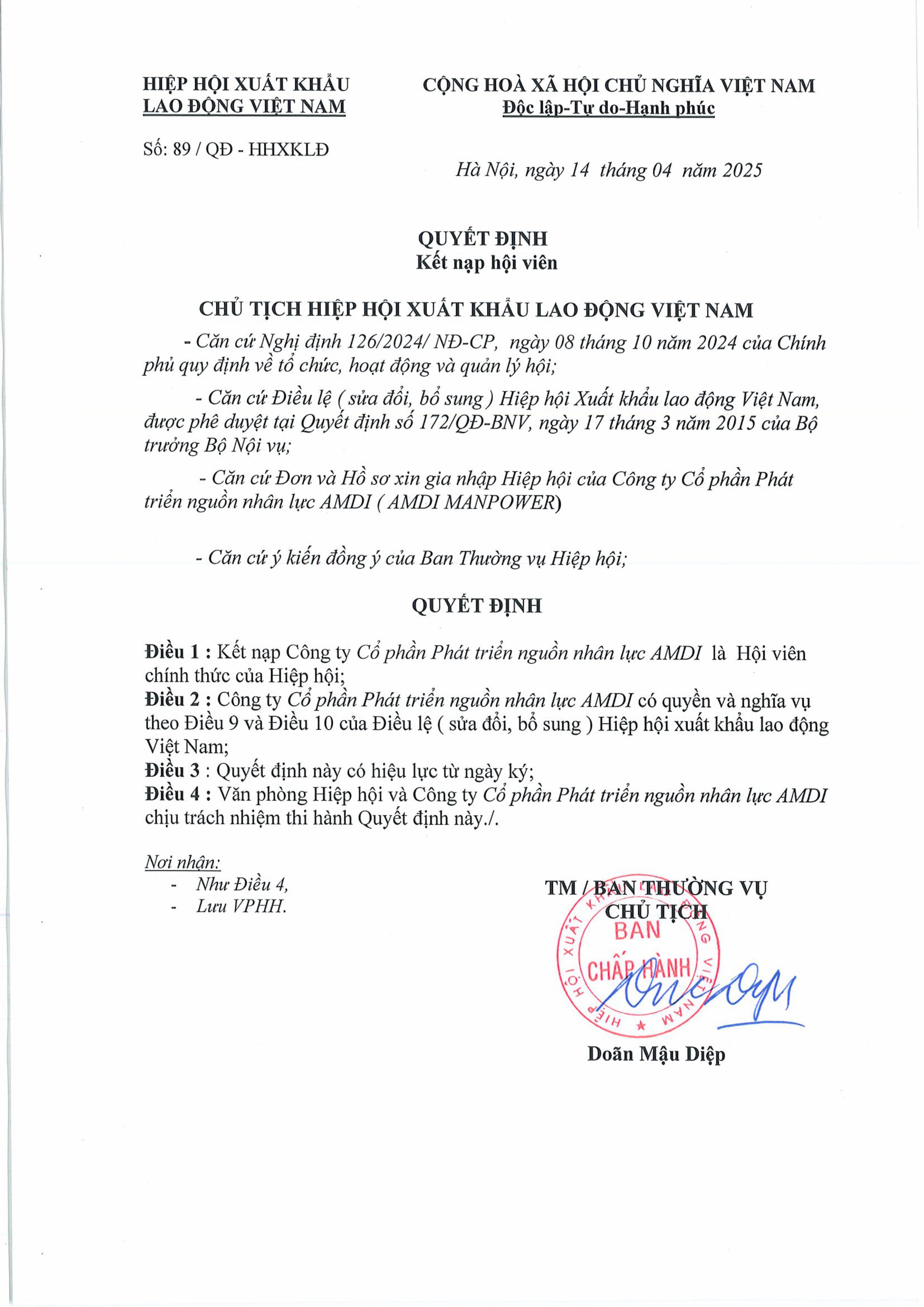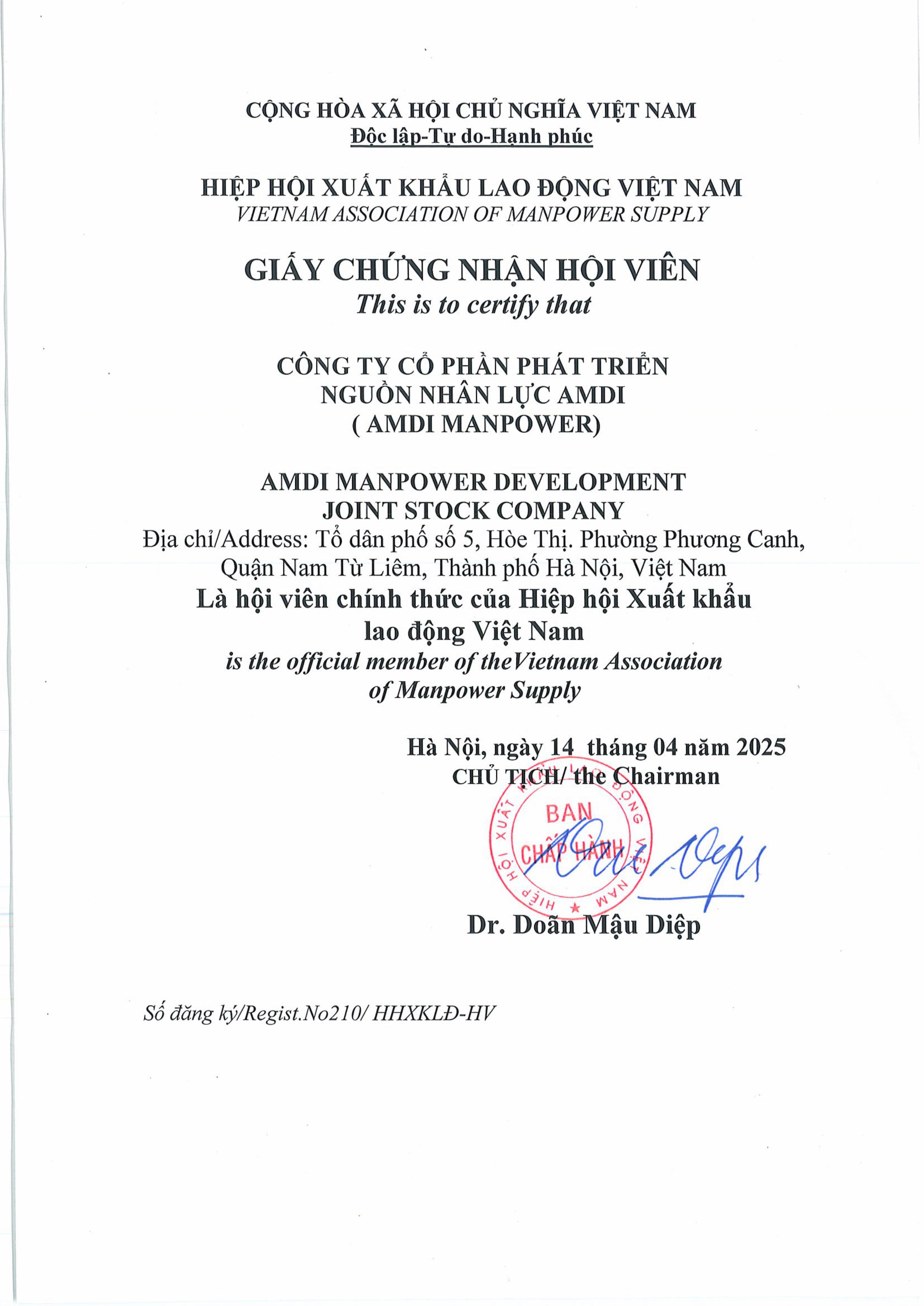 Công ty cổ phần phát triển nguồn nhân lực AMDI (AMDI MANPOWER) nhận giấy chứng nhận trở thành hội viện chính thức của Hiệp hội Xuất khẩu lao động Việt Nam